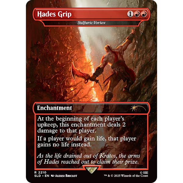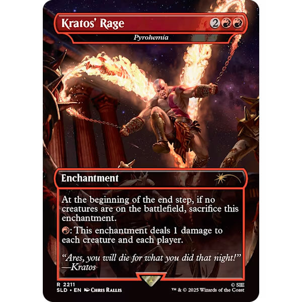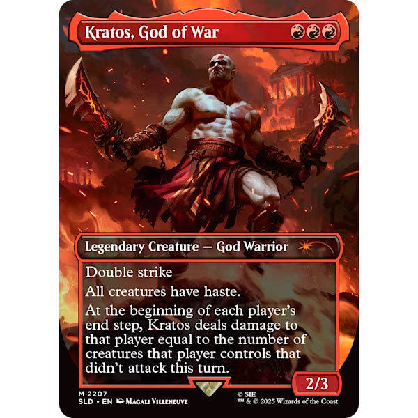 ¡Y ahora puede ser tu comandante! Secret Lair x God of War: Greek contiene un nuevo diseño para Kratos en su guerra contra los dioses griegos y en un drop monocolor rojo que ilustra su ardiente furia y su trasfondo espartano. Kratos siempre quiere pasar a la ofensiva, así que concédele la bendición de tener pasos de combate adicionales con World at War como “Battle of Olympus” y luego aprovecha tu furia con cartas que representan armas legendarias lo bastante poderosas como para acabar con lo divino, como “Blades of Chaos Bond”, “Hades Grip” y “Kratos’ Rage”.