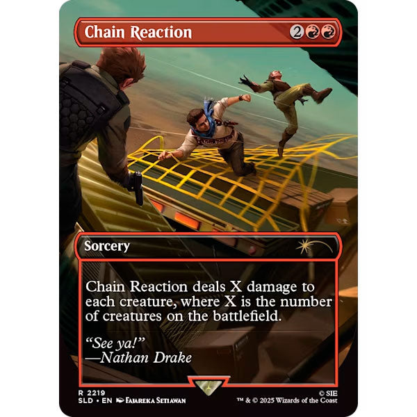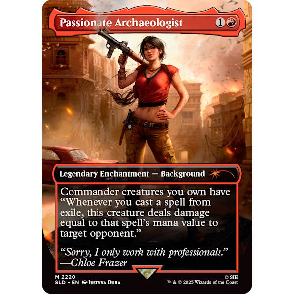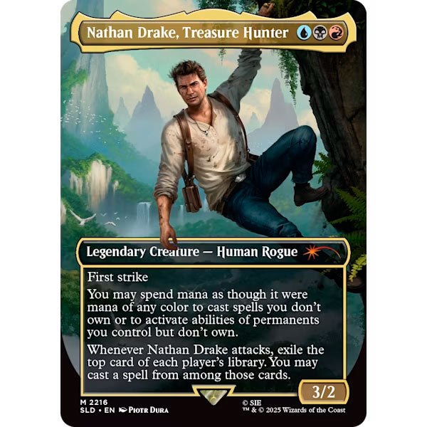 Secret Lair x Uncharted lleva al cazatesoros más temerario del mundo a Magic: The Gathering con estilo y un aspecto pícaro que cobra vida en un nuevo diseño en Magic. Por si fuera poco, por fin podrá tener al alcance de la mano los muchos artefactos y tesoros que quiere con el famoso Whip of Erebos como “El Dorado Sarcophagus”. O tal vez se limite a pasar el rato y esperar el momento adecuado para hacer su jugada con Midnight Clock como “Kings Bay Clock Tower”. En cualquier caso, le harán falta buenos aliados, como la carta Passionate Archaeologist, para garantizar que haya honor entre ladrones.
